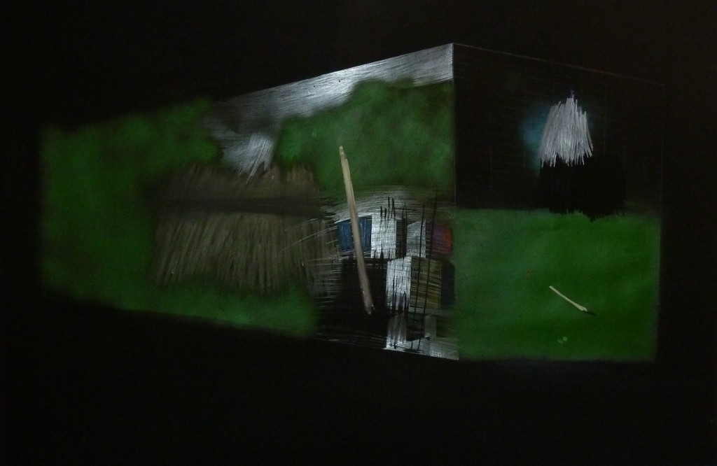 בעבודת הוידיאו “עלמא” (בארמית: עולם)  של שפוני הבנויה משברי מראות  מחוברות,  נוצר דימוי שלם דרך משחק של היטלי אור וצל מפורקים במטרה לבחון את הנסתר והגלוי לצופה.  בעבודתה של בן שלום “אישה בונה אישה הורסת  (נוף פנימי)” , היא מיצב העשוי ממשטחים גדולים של פחם ופיח שחור  המכסים את הנייר הלבן, ומתוכם מגיחים דימויים או מחוות ציוריות באמצעות גרפיט וגירים, ככתם של אור בתוך שכבת הפחם השחורה.  המשטחים תלויים על גבי קונסטרוקציית ברזל, כאשר ההצבה בשכבות מאפשרת לצופה מרחבי ביניים של התרחשויות בהם הוא מוזמן ל”שוטט”.